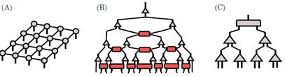 Figure 11: Depiction of other TN representations: a) projected entangled-pair states, b) multiscale entanglement renormalization, c) tree tensor networks