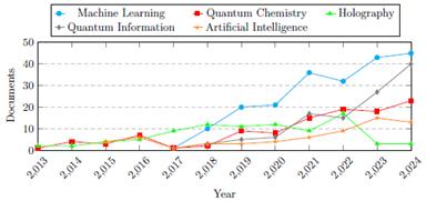 Figure 12: Number of documents published per year on TNs in the fields of machine learning, quantum chemistry, artificial intelligence, quantum information, and holography.