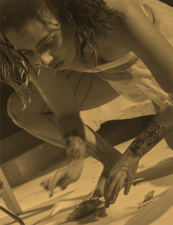 La actriz, Aramy ha realizado investigaciones y pro- yectos creativos en torno a las comunidades Guaraní, particularmente aquella conocida en Brasil como Kaiowas, que habita principalmente, el estado de Mato Grosso del Sur. Gracias a esta experiencia, en la acción performática se incluyen cantos de esta comunidad, interpretados por la actriz en el dialecto original.